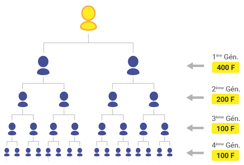 Exemple 1 : Un objectif de 10 filleules directes et votre réseau jusqu’au la 4e génération (11.110 membre) pourra vous rapporter plus de 284.000 F/mois soit 3.408.000 F/an de commissions d’ici 2 à 5 ans.